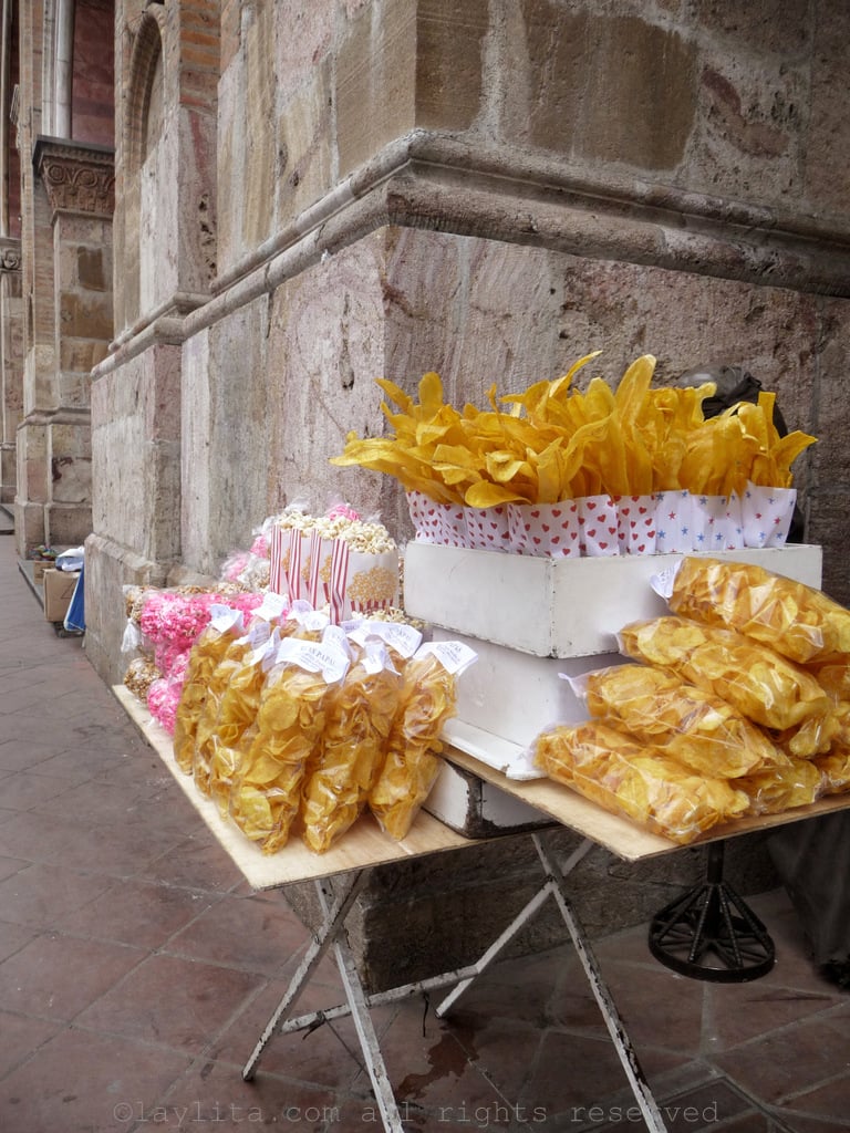 Chochos, chifles and tostado: Chochos (lupini beans), chifles (thin green plantain chips) and tostado (Andean corn nuts), and maybe popcorn, are the Ecuadorian equivalent of the chips and salsa that you automatically served at most Mexican and Tex-Mex restaurants in the US. And our hot sauce equivalent is either aji de tomate de arbol, a salsa made with tree tomatoes or tamarillos, or tomato and onion curtido salsa. This trifecta of snacks is also a very popular street food in the Highlands known as cevichocho or ceviche de chochos. The street vendors will mix the chocho beans in small plastic bowl/cup/bag, with the curtido salsa, and some lime juice, then add the the crunch tostado corn nuts and chifles on top. You can have aji or hot sauce added if you want, as well as other condiments like ketchup.