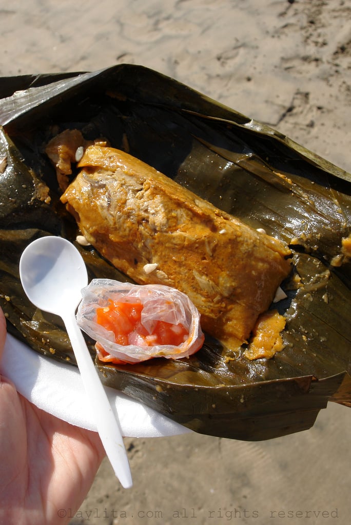 Corviche/ Bollos de pescado /Tortillas de verde or green plantain deliciousness: A corviche is a cross between a fried dumpling, a fritter, and fish cake. The dough is made from green plantains and it has a fish filling –usually corvina fish from which it gets its name. Corviches are usually sold at the beach and are especially popular in the coastal province of Manabi. They are served with tomato and onion curtido salsa. Bollos de pescado are another green plantain, peanut, and fish specialty from the coast, the best way to describe bollos is that they are like tamales made with green plantain dough, filled with fish – usually albacore tuna, wrapped in banana leaves, and steamed. They are so delicious and are served with slices of lime, lime pickled onions or curtido, and aji hot sauce. Tortillas de verde are thick green plantain patties stuffed with cheese.